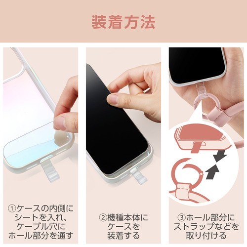 ●ケースにストラップホールがなくても、付属のストラップホールシートをスマートフォンとケースの間に挟むだけで使用でき、取り外しも簡単です。