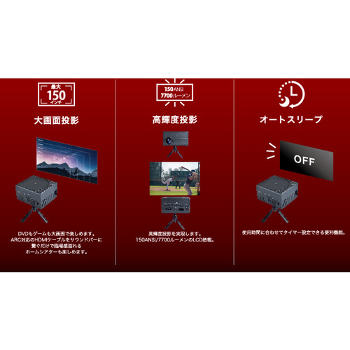 同等製品に比べ小型化に成功。150ANSIルーメン 7700ルーメン高性能で明るい画質。