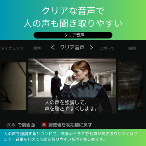 地デジやBS・CS放送はもちろん4K放送やネット動画も、大画面で視聴しても高精細でなめらかに自然な高画質で楽しめる、進化した新エンジン。高速レスポンス、進化したノイズリダクション、快適な操作性を備えました。さらに、ネット動画で発生する圧縮ノイズやバンディングを抑制することで、大画面で視聴してもなめらかで自然な高画質を実現します。