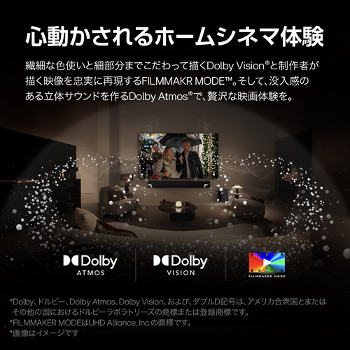 繊細な色使いと細部分までこだわって描くDolby Visionと制作者が描く映像を忠実に再現するFILMMAKR MODE。そして没入感のある立体サウンドを作るDolby Atmosで、贅沢なエンターテイメント体験をお楽しみいただけます。