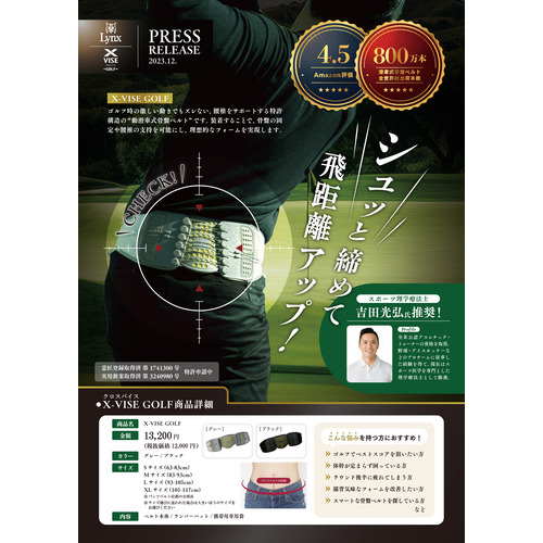ゴルフ時の激しい動きでもズレない、腰椎をサポートする特許構造の“動滑車式骨盤ベルト”です。装着することで、骨盤の固定や腰椎の支持可能にし、理想的なフォームを実現します。