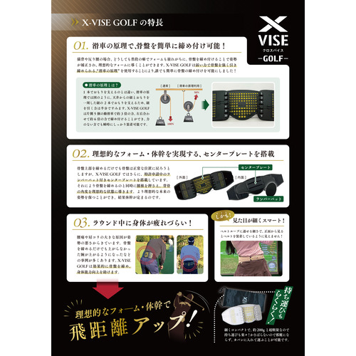 猫背や反り腰の場合、どうしても普段の癖でフォームも崩れがちに。骨盤を締め付けることで姿勢が補正され、理想的なフォームに導く事が出来ます。X-VISE GOLFは弱い力で骨盤を強く引き締められる滑車の原理を使用することにより、誰でも簡単に骨盤を締め付けることを可能にしました。