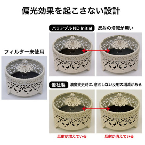 Kenko「バリアブルND Initial」はこの偏光効果が起こらないように設計されているため、安心して使用することができます。