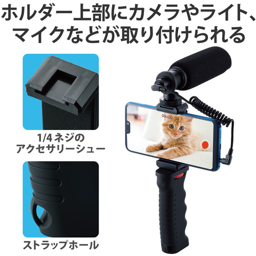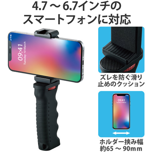 ●手ブレを軽減しながら動画撮影ができるハンドグリップ付きスマートフォンホルダーです。