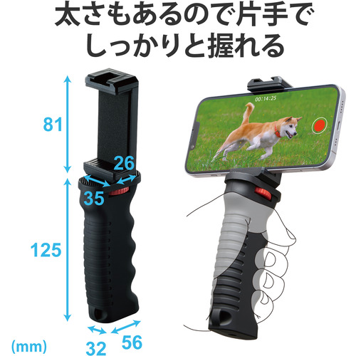 外形寸法:ハンドグリップ:W約56mm×D約32mm×H約125mm、スマートフォンホルダー:W約35mm×D約26mm×H約81mm