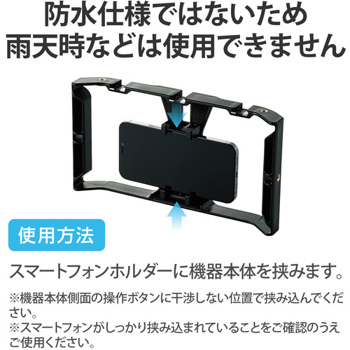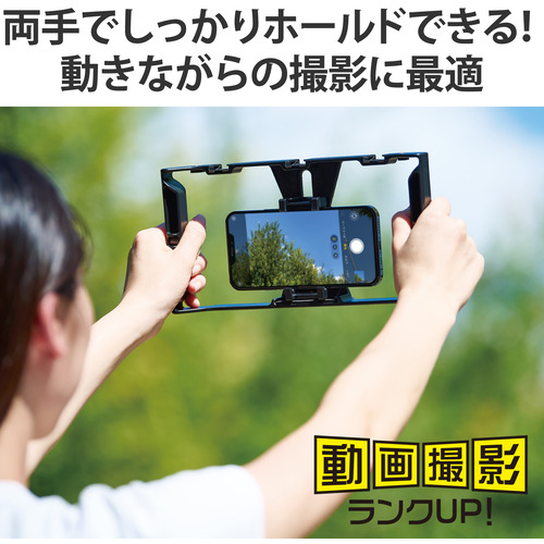 ●カメラやライト、マイクなどの撮影機材をカスタマイズして装着できる、動画撮影用スマートフォンホルダーです。両手で持てるので安定性が高く、動きながらの撮影に最適です。ホルダー上部には、撮影に必要な機器が取り付けられるアクセサリーシューが3つ付いています。