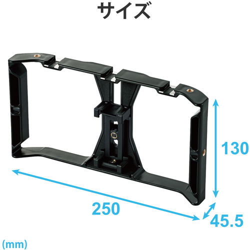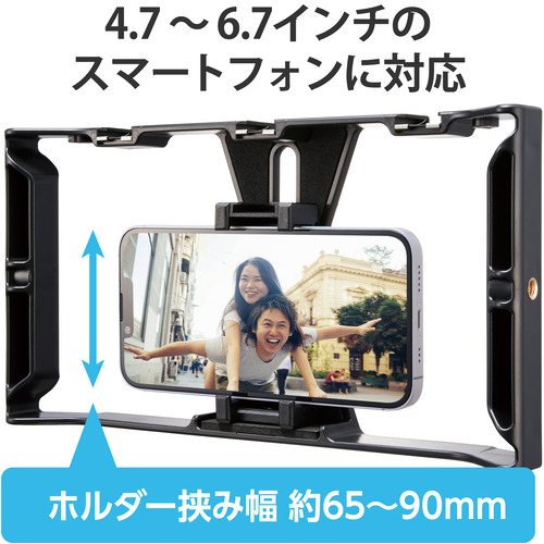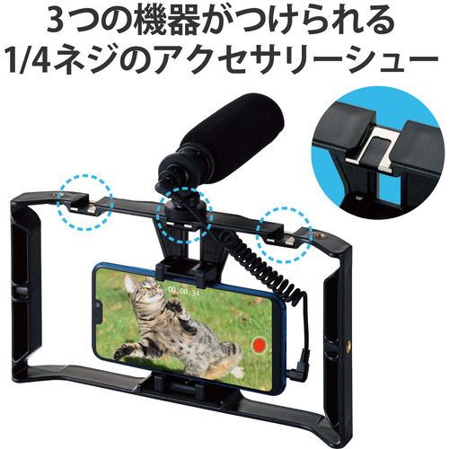●カメラやライト、マイクなどの撮影機材をカスタマイズして装着できる、動画撮影用スマートフォンホルダーです。