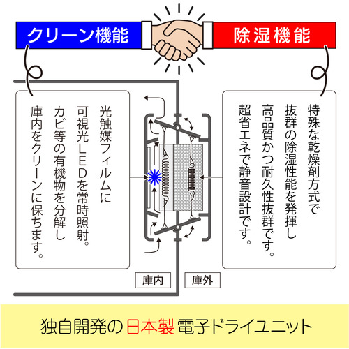 オートクリーンドライの電子ドライユニットには光触媒機構が内蔵されており、庫内の湿度を下げるだけでなく、光触媒機構により庫内のクリーンな状態に保ちます。