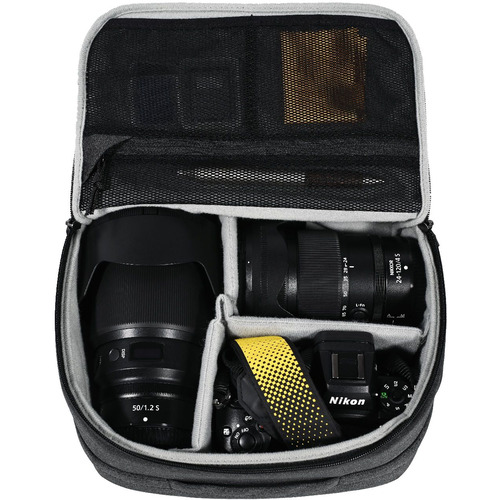 機能性が高く持ち運びに便利な本製品は、プロ向け・ハイアマチュア向けのカメラやレンズを複数収納でき、カードやクロス、小物を収納できるポケットを装備したバッグインバッグです。
