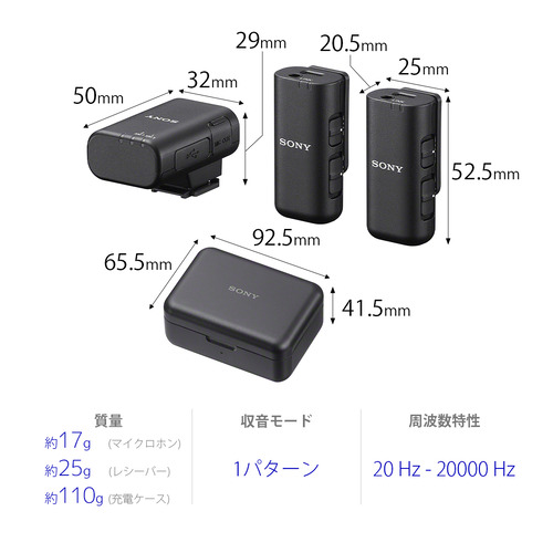 最大外形寸法(約):マイクロホン(トランスミッター)幅 25.0 mm x 高さ 52.5 mm x 奥行き 20.5 mm レシーバー幅 32.0 mm x 高さ 29.0 mm x 奥行き 50.0 mm 充電ケース幅 92.5 mm x 高さ 41.5 mm x 奥行き 65.5 mm