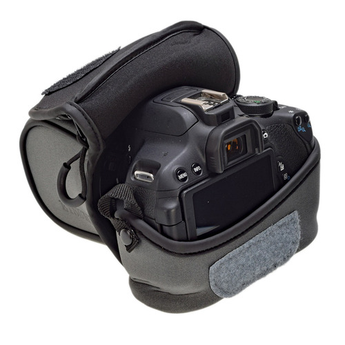 ●伸縮性のあるクッション素材でカメラにフィットする小型カメラケース。背面には中身が見える透明ポケット付き。