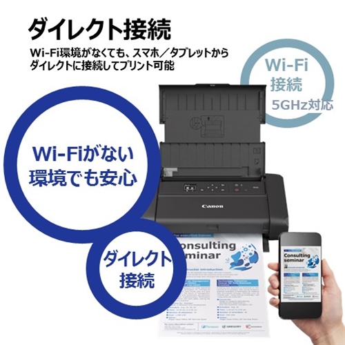●本体に定型文書データが5つまで保存可能*。顧客訪問時に営業ツールや帳票類などが必要になった時や、通信環境が整っていない場所での打ち合わせの時などに、本体から直接プリントできます。*データ保存はWindowsドライバー経由となります。保存容量等の詳細はキヤノンホームページでご確認ください。