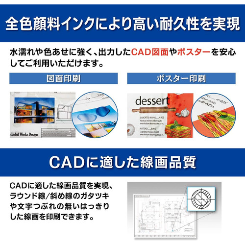 ラウンド線/斜め線のガタツキや文字のつぶれのないはっきりとした線画を高速(A1約46秒)で印刷できます。 【仕様】