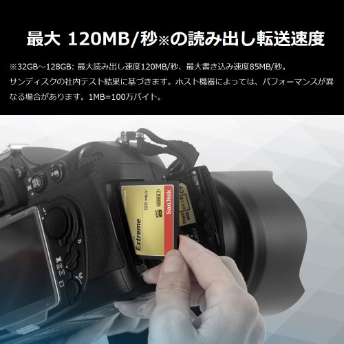 最大書き込み速度85MB/秒のサンディスク エクストリーム コンパクトフラッシュカードは、連写、高速撮影、RAW+JPEG撮影において、中級から最上位クラスのデジタル一眼レフの性能を最大限に発揮します。
