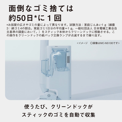 ・面倒なゴミ捨ては約50日に1回(※お部屋の広さやゴミの量によって異なります。試験方法:家庭じんあい1g(細塵 3:綿ゴミ4の割合。家庭ゴミ1日分の平均量=1g。一般社団法人 日本電機工業会自主基準の調査において。)をスティック本体からクリーンドックに移動させる。この操作をクリーンドックの紙パック交換ランプが点滅するまで繰り返す。※) ・クリーンドックは紙パック式でゴミ捨て簡単・清潔