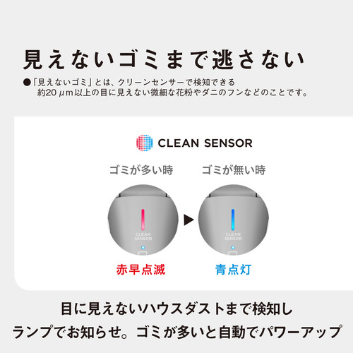 目に見えないハウスダストまで検知しランプでお知らせ。ゴミが多いと自動でパワーアップし効率的にお掃除。