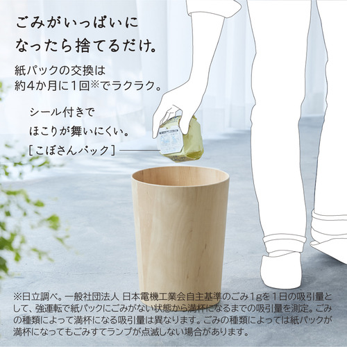 紙パックの交換は約4か月に1回(※)でラクラク。集めたごみを強い吸引力で圧縮。ごみがたまってきてもパワーが長もちする「パワー長もち流路」で紙パックいっぱいまでごみをためられます。「紙パックするりん構造」で満杯に膨らんだ紙パックを簡単に取り出せます。シールふたで密閉するから、ほこりが舞いにくくごみがこぼれにくくなります。※日立調べ。ごみの種類や量、環境や使い方により異なります。