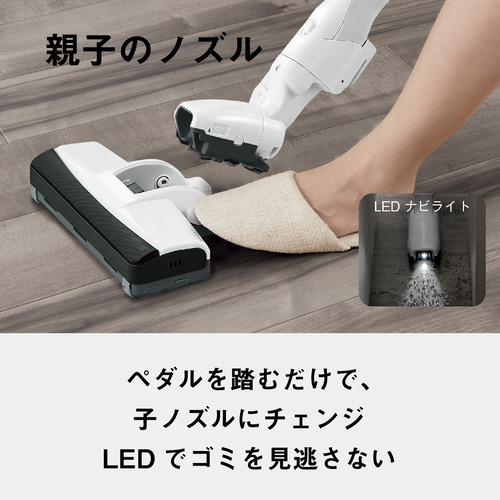ノズル:タイプ:パワーノズル、特殊加工ローラー、ふき掃除性能(フローリングの菌までふき掃除(※ふき掃除は、水拭きする機能ではありません。また、こぼした液体などが乾燥して付着した汚れは取れません。菌までふき掃除効果は、床面の状態により異なります。また、フローリングの段差や溝に入り込んだ菌は取れない場合もあります。99%以上の除去効果はふき掃除直後のものであり、長時間の効果を保証するものではありません。長期間の使用によるブラシの劣化等で、99%以上の除去効果は減少します。【試験依頼先】(一財)日本食品分析センター【試験方法】菌を塗布した木材(フロア材:溝なし)の上を床ノズルで1往復掃除【試験結果】99%以上(当社計算値)の除去効果 試験成績書発行年月日:令和2年5月14日 試験成績書発行番号:第20031206001-0101号※))、親子ノズル、LEDナビライト(子ノズル)、エアダストキャッチャー