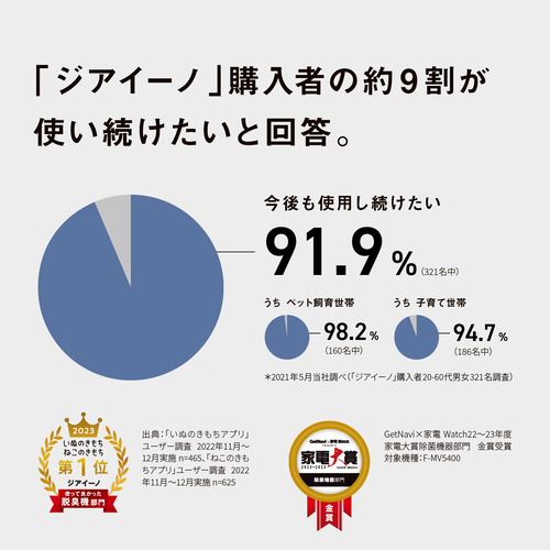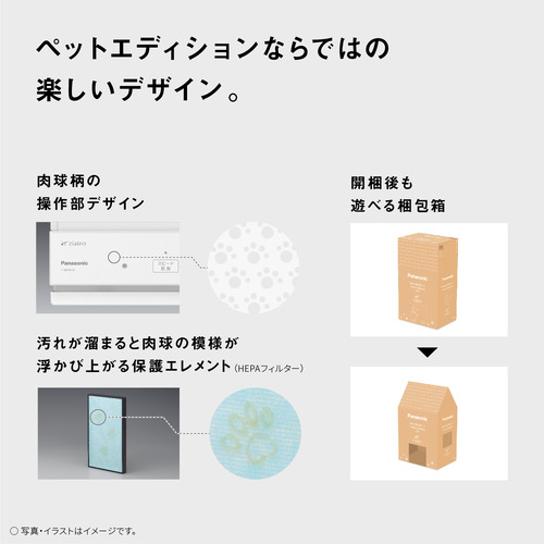 (1)ペットインテリアトレンドに調和する白基調デザイン (2)肉球マークが浮かび上がる保護エレメント(HEPAフィルター) (3)開梱後も遊べる梱包箱