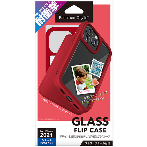 PGA PG-21NGF04RD iPhone 13 Pro用 ガラスフリップケース Premium Style レッド