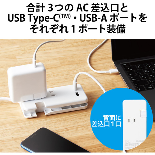 ●片面に2つ、もう片面に1つの合計3つのAC差込口と、USB Type-C(TM)(USB-C(TM))とUSB-Aポートをそれぞれ1ポートずつ備えたモバイルUSBタップです。