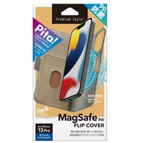 PGA PG-21NMGFP02BE iPhone 13 Pro用 MagSafe対応 抗菌フリップカバー Premium Style ベージュPG21NMGFP02BE