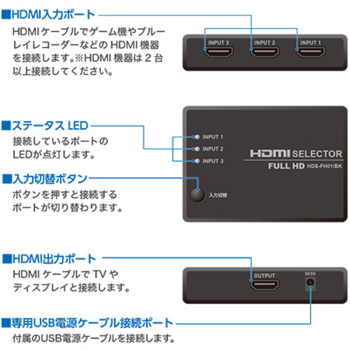 最大3台までのHDMI機器を接続することができるHDMI切替器です。