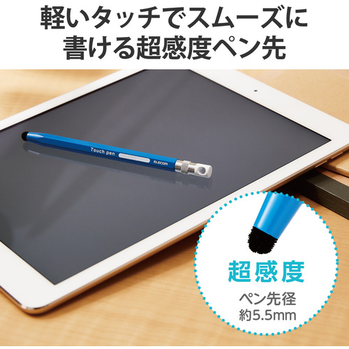 エレコム P-TPENCEBU スマートフォン・タブレット用タッチペン 六角鉛筆型 ストラップホール付き 超感度タイプ ペン先交換可能 ブルー