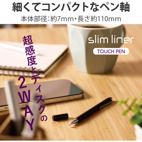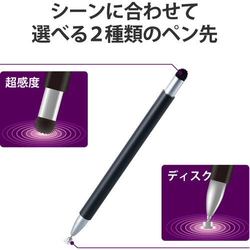 ●滑らかなペン滑りの超感度タイプと、細かな操作がしやすいディスクタイプの2種類のペン先を採用し、用途で選べる2WAYスリムタッチペンです。
