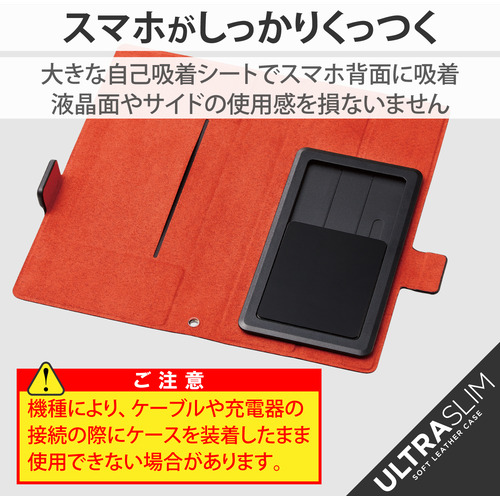 ●スマートフォンがピタッとくっつく自己吸着シートを採用し、機種を選ばず使用できる薄型・軽量タイプの手帳型マルチカバー。