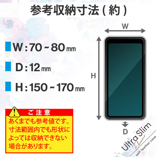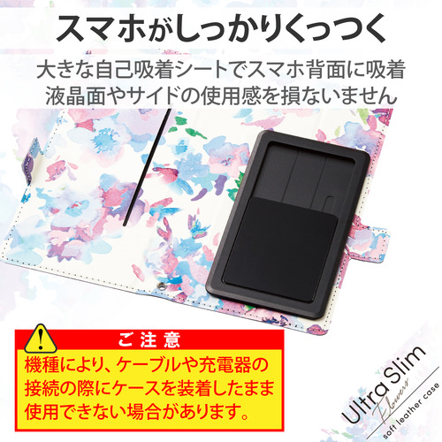●スマートフォンがピタッとくっつく自己吸着シートを採用し、機種を選ばず使用できる、ケース内側に愛らしいフラワープリントを施した薄型・軽量タイプの手帳型マルチカバー。