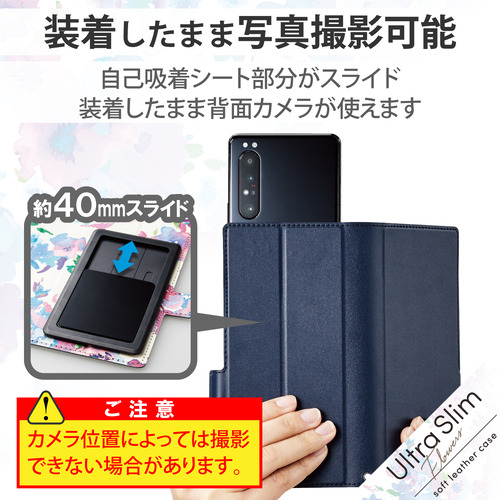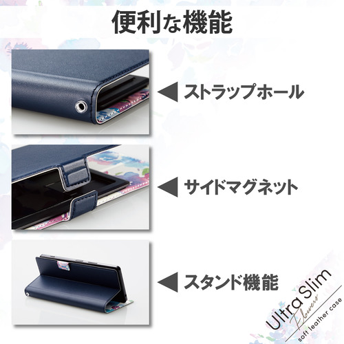 エレコム P-05PLFUSJBU スマートフォン用マルチレザーケース スライド式 手帳型 UltraSlim Flowers 薄型 磁石付き Lサイズ ネイビー P05PLFUSJBU