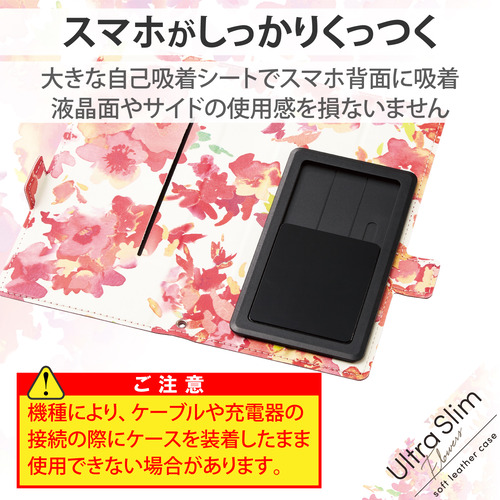 ●スマートフォンがピタッとくっつく自己吸着シートを採用し、機種を選ばず使用できる、ケース内側に愛らしいフラワープリントを施した薄型・軽量タイプの手帳型マルチカバー。