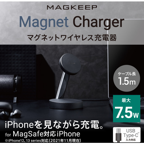 ●MagSafe対応iPhoneシリーズをマグネットで固定でき、7.5Wで高速充電可能なワイヤレス充電器です。