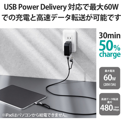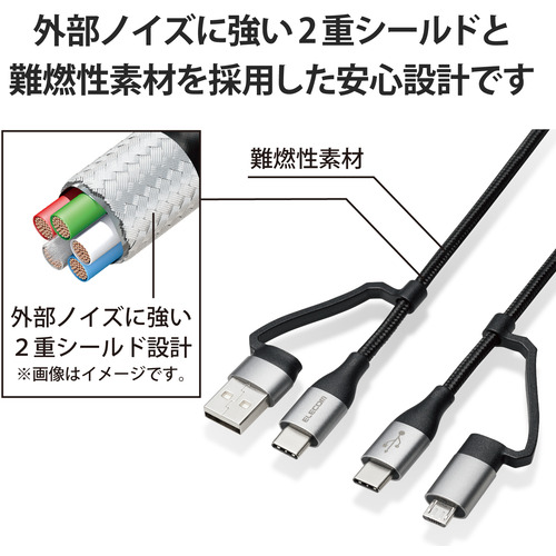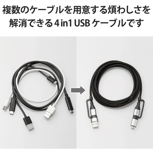 エレコム MPA-AMBCC20BK 4in1 充電ケーブル ( USB Type C + USB A to USB Type C + microUSB ) PD 60W対応 ケーブル 2m ブラック