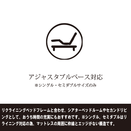 リクライニング対応:シングルとセミダブルのみ対応 ※ダブルサイズ以上は枠線とエッジが入ることでマットレスの縁部分が硬くなります。
