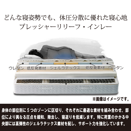 身体の部位別にゾーンを区切り、それぞれに最適な素材を組み合わせ、部位により異なる圧点を緩和、除去して寝返りを低減する「5ゾーン・プレッシャーリリーフ・インレー」
