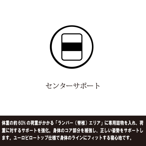 ボリュームのあるユーロトップ仕様で表面は柔らかく、腰部はしっかりと支える内部構造になっており絶妙な寝心地です。マットレスの縁をウレタンで囲ったウレタンケース仕様で、端まで寝床面積を広くお使いいただけます。「センターサポート」により腰の部分のサポート力をさらに強化しています。体重の約60%の負荷はマットレス中央部分のランバー(脊椎)エリアにかかります。そこに専用の詰物を入れることで身体のコア部分を補強し、正しい寝姿勢をサポートします。