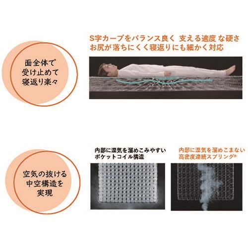 ●内部に湿気をためこまず、いつでも爽やかな寝心地を実現。鋼線の劣化を防ぎスプリングの寿命を守ります。