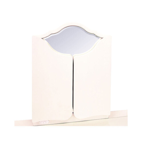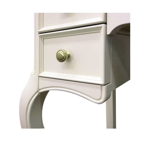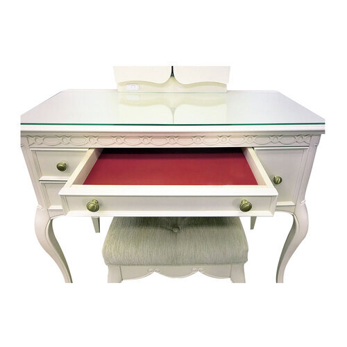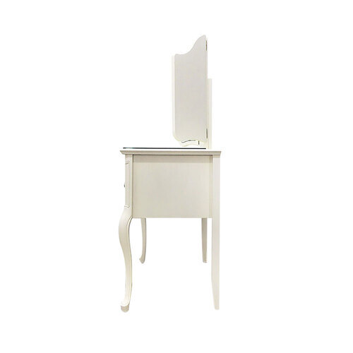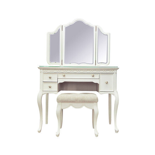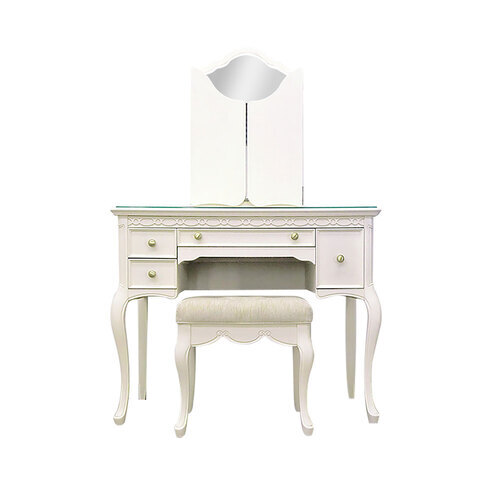 木肌がうっすら見えるホワイトウォッシュ塗装で仕上げたフレンチクラシックエレガンスなドレッサーです。曲線ラインが魅力的な猫脚タイプのデザインで、引出し前板は矢羽根模様貼りを施すことで、高級感を表現しています。中央下段の薄い引き出しは、内部にフェルトを貼ってあるのでアクセサリー収納として利用できます。鏡は便利な三面鏡仕様で、1200Wの1口コンセントも付属しています。スツールはモケット調の張地で、ボタン締めをしたデザインになっています。 【仕様】
