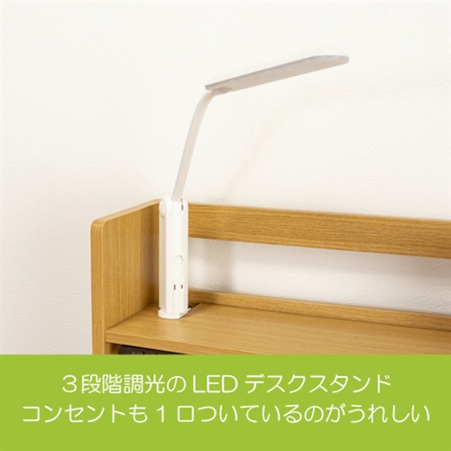 LEDデスクスタンド:3段階調光。コンセント1口付(6A 600Wまで)。消費電力8W