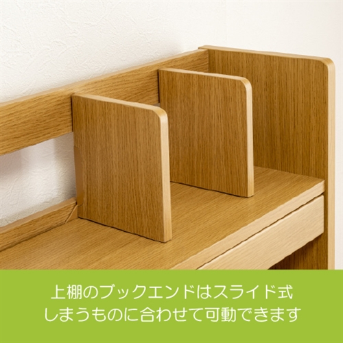 上棚のブックエンドになる棚板はスライド式なので収納するものに合わせて調整できる。下棚の棚板も位置が変えられます。
