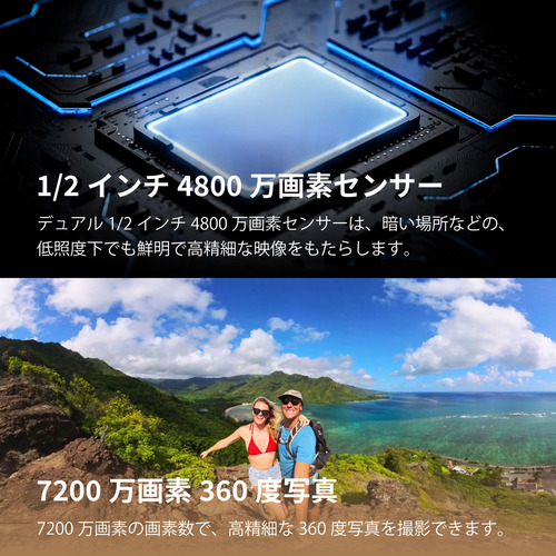 動画解像度:●360度 5.7K:5760×2880 @ 30 / 25 / 24fps4K:3840×1920 @ 60 / 30fps3K:3008×1504 @ 100fps●シングルレンズモード 4K:3840×2160 @ 30 / 25 / 24fps3.6K:3584×2016 @ 60 / 50 / 30 / 25 / 24fps2.7K:2720×1530 @ 60 / 50 / 30 / 25 / 24fps1080P:1920×1088 @ 60 / 50 / 30 / 25 / 24fps