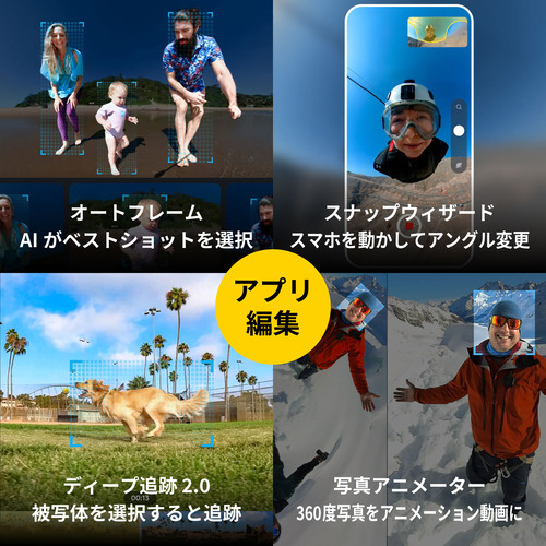 「フレームで空間の一部を切り取る」のではなく、「撮影場所の空間をそのまま360度全方位を写真・映像に残す」アクションカメラです。360度撮影、アクションに耐えるハードウェア、AI駆動型ソフトウェアを備えたInsta360 X3は究極のポケットサイズのカメラです。