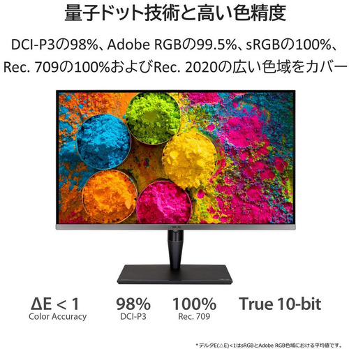 量子ドット技術により、DCI-P3の98%、Adobe RGBの99.5%、sRGBの100%、Rec. 709の100%および Rec. 2020の色域をカバーし、ビデオ編集およびポストプロダクションの作業効率を上げます。