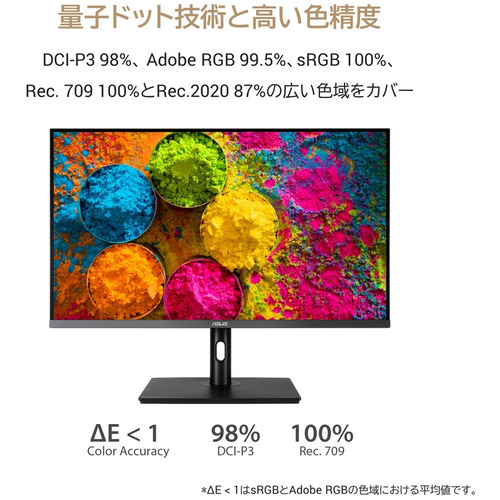 広視野角のIPSパネルは1,000 nitsのピーク輝度を備えており、広い色域を実現する量子ドット技術にも対応しています。また、DCI-P3の98%、 Adobe RGBの99.5%、sRGBの100%、Rec. 709の100%とRec.2020の87%の広い色域をカバーしており、幅広いカラーカバレッジを実現しています。