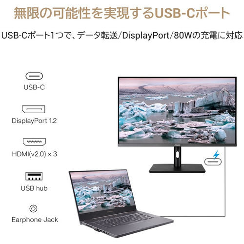 入出力端子:デジタル入力:USB-C×1 (PD 80W 出力)、DisplayPort 1.2×1、HDMI(v2.0)×3、USB HUB:2x USB 3.2 Gen 1 Type-A、オーディオ出力:3.5mmステレオミニジャック×1