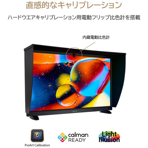 内蔵の電動比色計を使用したキャリブレーションに対応しています。モニターはキャリブレーションされ、その後ルックアップテーブルが書き換えられるため、設定を調整することなく、異なるOSやアプリケーションを搭載したデバイスをモニターに接続することができます。すべてのカラーパラメータのプロファイルをPCではなく、ProArtモニターの内部スケーラーICチップに保存できます。保存されたプロファイルは、モニターのホットキーを使用して簡単に有効化できます。