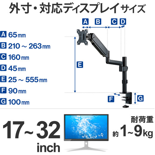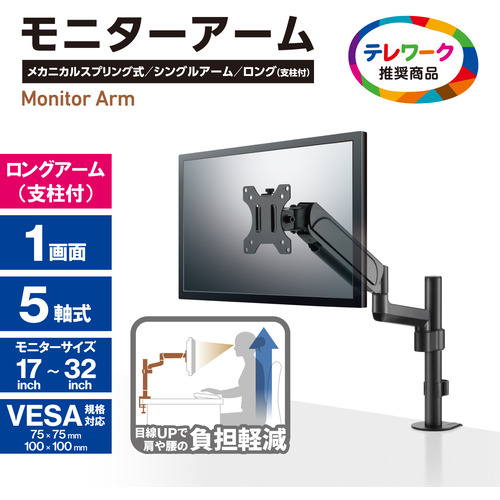 ●17‾32インチサイズのモニターに対応するロングアームのメカニカルスプリング式シングルモニターアームです。