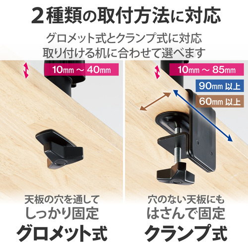 取り付け可能天板厚:クランプ:10‾85mm、グロメット:10‾40mm